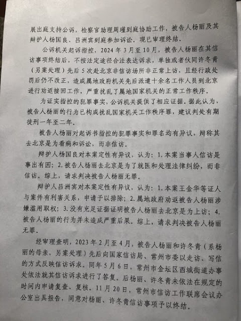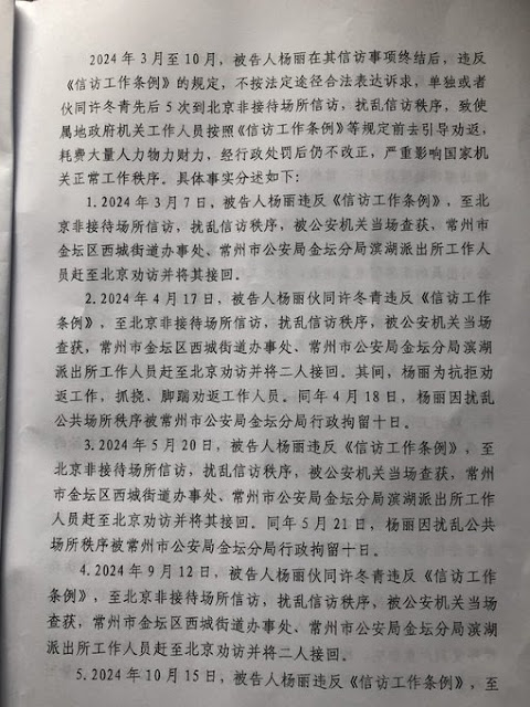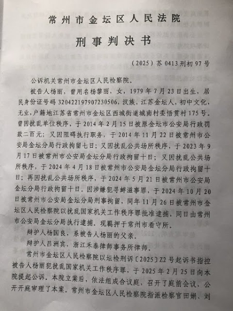 (维权网信息中心报道)2025年9月13日,本网获悉:据流亡日本的杨彩英女士通报:2025年9月12日,金坛区人民法院副院长刘丽疆、该院刑庭副庭长王囡囡,宣布冤判我母亲许冬青1年2个月,我妹杨丽1年3个月。该判决将我母亲和妹妹找中共党魁习近平控告江苏官员田洪和落马官员陈金虎侵犯人权、要求保障就医权利的行为认定为对征地和司法不公等信访处理结果不服而进行所谓的非访;将金坛黑警多次殴打、绑架不让我母亲和妹妹看病的行为认定为“劝返”;将暴力截访黑警和信访官员挥霍的巨额维稳经费和口述认定为判决依据。