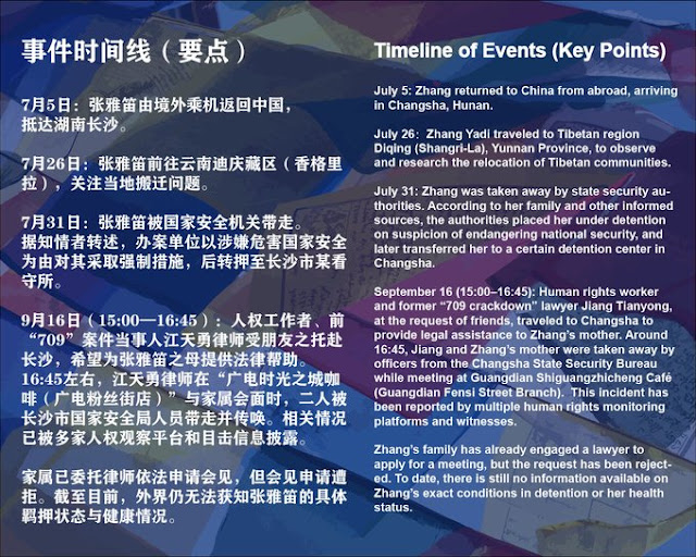 -2025年9月16日:人权工作者、709律師江天勇赴长沙为张雅笛之母提供法律帮助。16:45左右,江天勇与张雅笛之母在广电时光之城咖啡(广电粉丝街店)会面时,被国家安全局人员带走传唤。