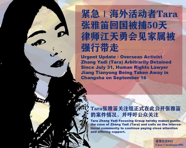 (维权网信息中心报道)2025年9月18日,本网获悉被抓捕羁押的海外活动者张雅笛Tara的案情,现在通报如下: