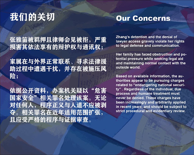 家属已委托律师依法申请会见,但会见申请遭拒。截至目前,外界仍无法获知张雅笛的具体羁押状态与健康情况。