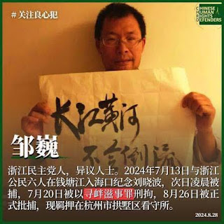 邹巍因海祭诺贝尔和平奖得主刘晓波,被中共以涉嫌寻衅滋事罪抓捕关押,今年9月中旬案件开庭后一直未宣判。2025年10月6日,邹巍之父邹福明在杭州去世,羁押在看守所的邹巍无法参加父亲的葬礼。