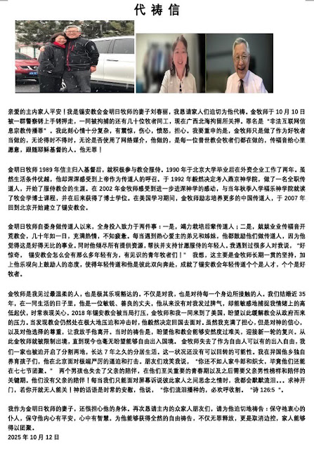 亲爱的主内家人平安!我是锡安教会金明日牧师的妻子刘春丽,我恳请家人们迫切为他代祷。
