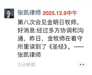 (维权网信息中心报道)2025年12月10日,本网获悉:据张凯律师昨日通报:“第八次会见金明日律师。好消息:经过多方协调和沟通,昨日,金明日牧师在看守所里读到了《圣经》。”此前,金明日牧师为读到《圣经》不惜绝食抗争。