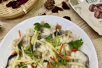 鳗鱼片洗净,加入酸梅、油、松茸鲜抓均匀腌制片刻。摆入盘中,均匀加入姜丝、辣椒丝。