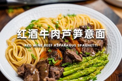 把酱汁和黑松露酱淋在意面、芦笋和牛肉上即可红酒牛肉芦笋意面的烹饪技巧