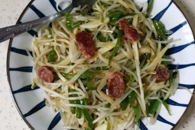 依次放入茭白丝、青椒丝、豆芽丝煸炒,然后放入虾油、六月鲜煸炒,放入一点热水,以免太干,中小火,加盖焖一会儿