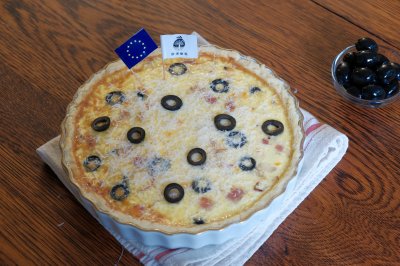 煎熟培根,炒熟洋葱,放入烤好的派皮中,倒入蛋奶液。放入黑橄榄切片。