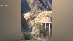 从网路视频中可见,大桥下方的山头有大量山石倾泻而下,紧接着,靠近山头一侧的桥墩和桥面一节节断裂垮塌,坠入下方的脚木足河中,腾起巨大烟尘,只剩下半截桥体立在河中。