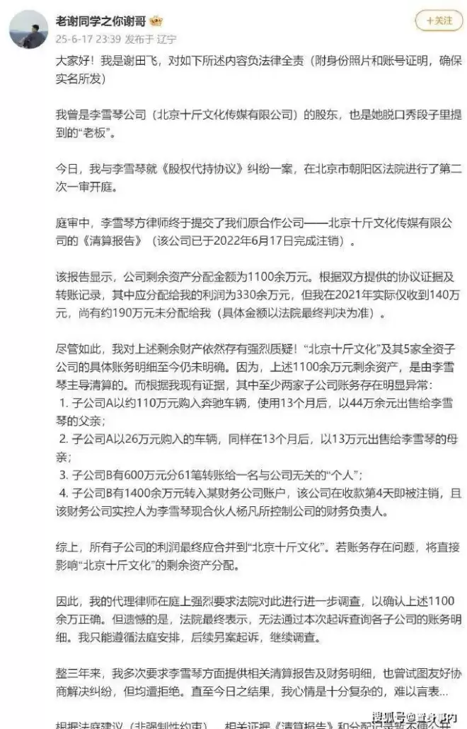 深夜,一份转账记录截图点燃热搜。谢田飞,那个曾被李雪琴写进文章里、称为“彼此贵人”的创业老友“老谢”,把最后一块遮羞布扯了下来。