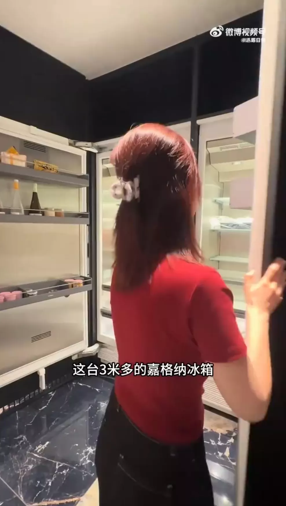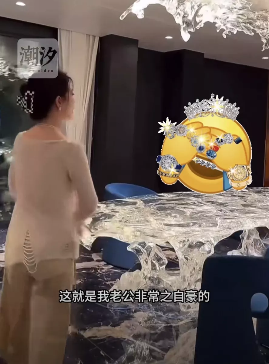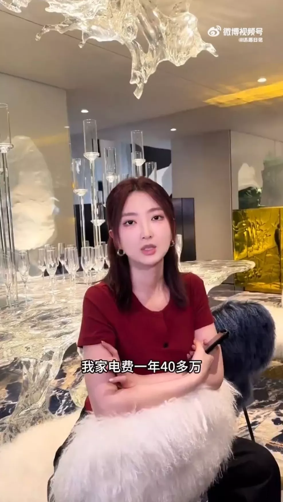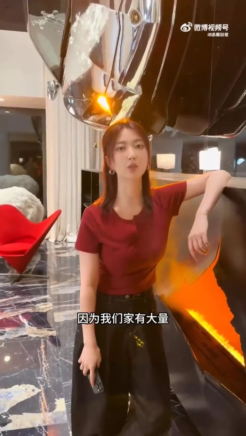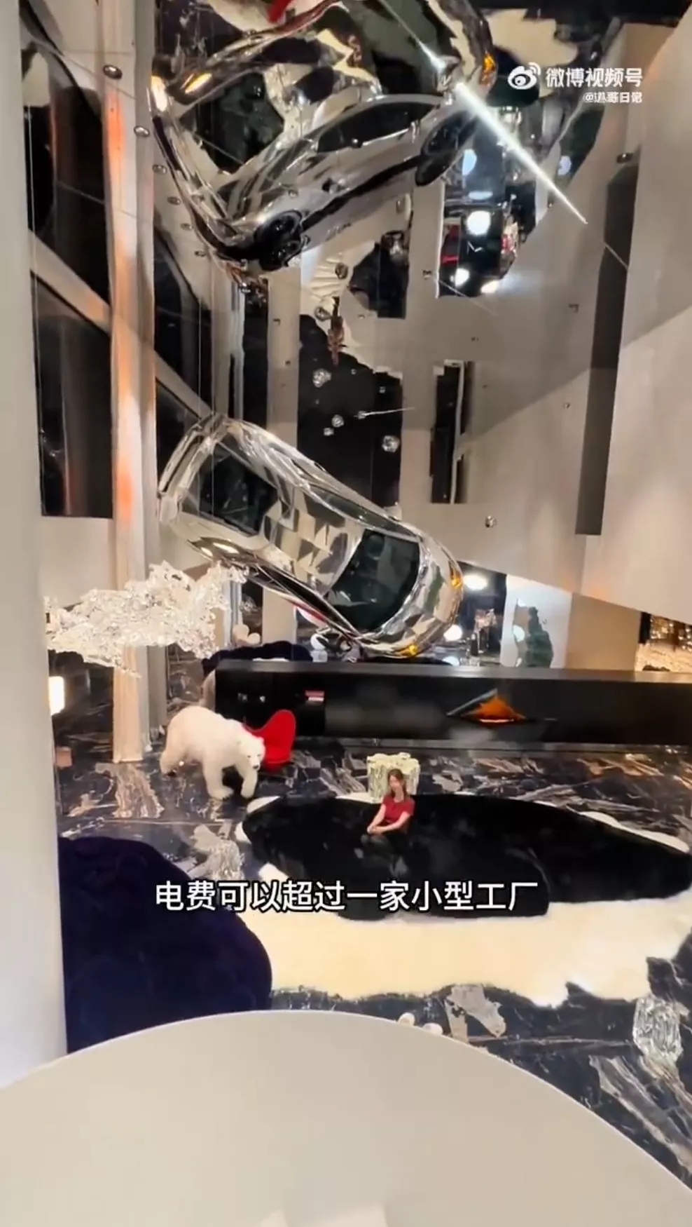 大叶子拍片炫耀豪宅电费惊人原因,家中还挂著林宝坚尼当装饰品。(微博影片截图)
