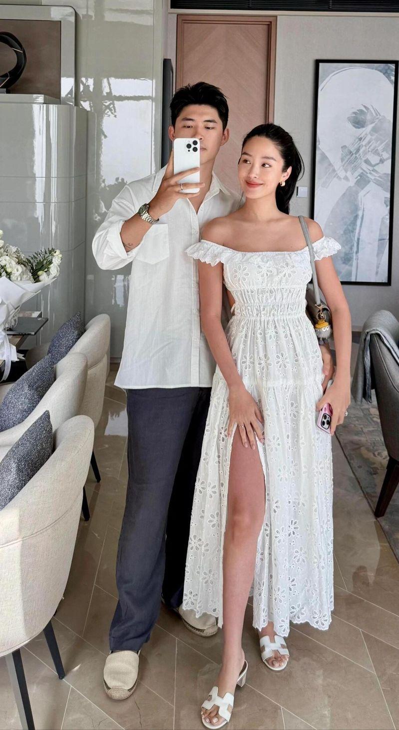 综合媒体报导,合照中杨采钰头扎马尾穿著白色连身裙大秀美腿,气色状态都很不错,杨采钰老公同样颜值在线,两人灿笑同框,看来十分般配也恩爱幸福。杨采钰老公还分享一张杨的背影照,她拎起裙摆满脸微笑站在走廊,小表情写满幸福。