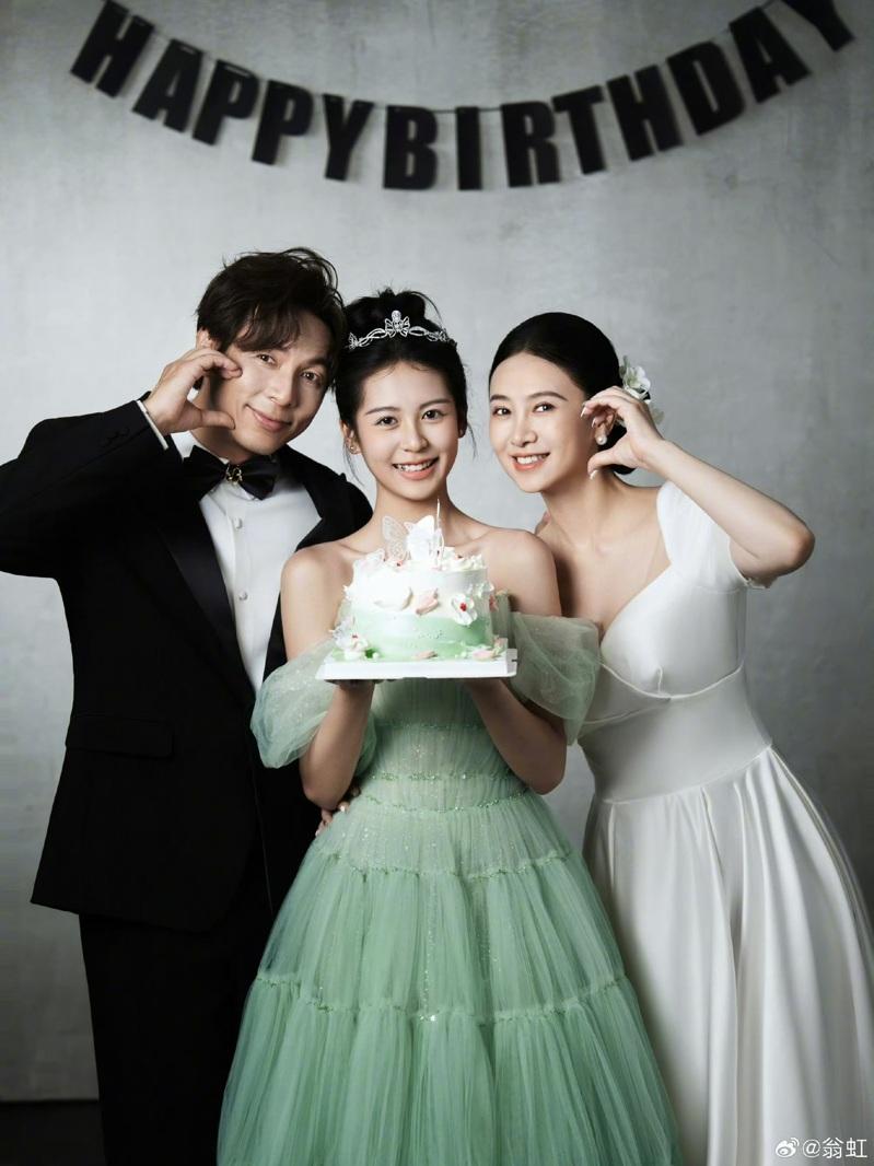 翁虹(右起)、女儿刘莳和老公刘冠廷庆祝女儿18岁生日。(取材自翁虹微博)