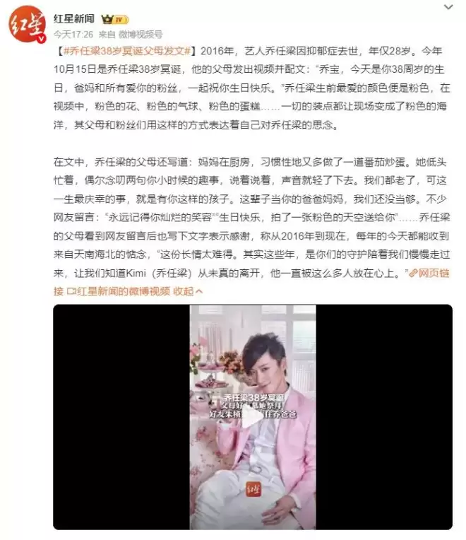 2016年,艺人乔任梁因抑郁症去世,年仅28岁。今年10月15日是乔任梁38岁冥诞,他的父母发出视频并配文:“乔宝,今天是你38周岁的生日,爸妈和所有爱你的粉丝,一起祝你生日快乐。”乔任梁生前最爱的颜色便是粉色,在视频中,粉色的花、粉色的气球、粉色的蛋糕……一切的装点都让现场变成了粉色的海洋,其父母和粉丝们用这样的方式表达着自己对乔任梁的思念。