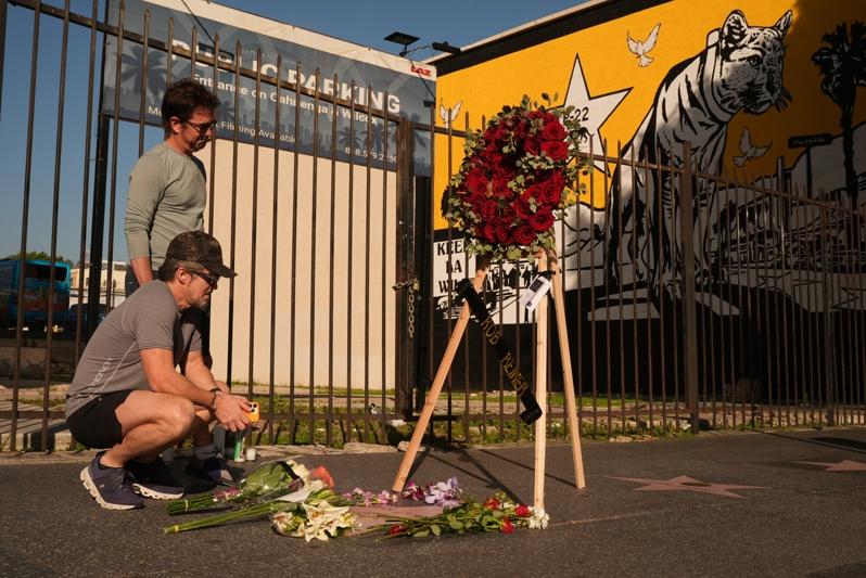 洛杉矶好莱坞星光大道上,罗伯雷纳的星形奖章前摆放着鲜花花圈。(美联社)