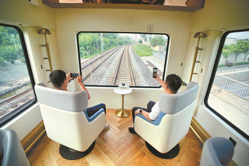 4节观光车厢内,电动按摩椅、可折叠桌板让人放松身心,充裕的USB充电口方便充电。旅客对坐或品茗,或玩桌游,享受优闲时光。也有旅客坐在对窗座椅上沉浸式赏景,阳光从车窗透进车厢,城郊景色在眼前一幕幕闪过,让人惬意又放松。
