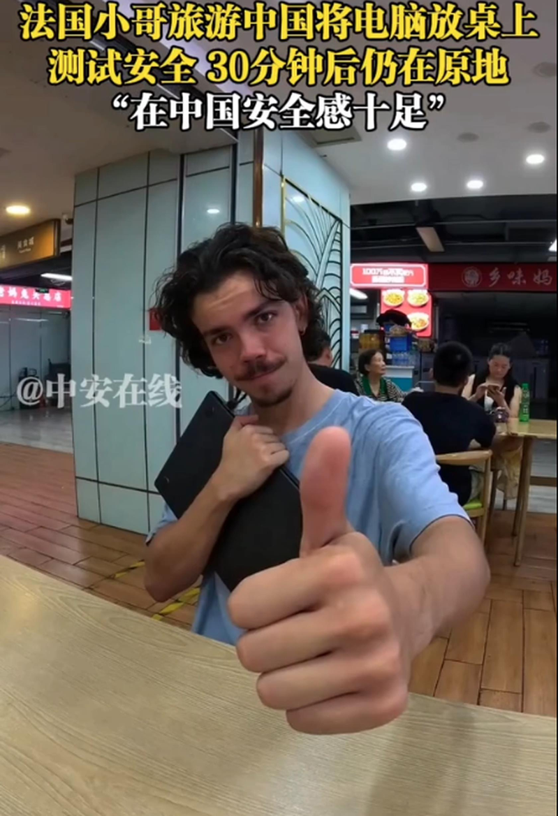 这名法国视频博主在视频配文中写道,「在中国,安全感和公众信任感截然不同。」他说这次实验不仅是运气测试,更在于体验安全感与社会规范如何塑造日常生活,「全天候公共监控、低犯罪率以及抵制小偷小摸的文化氛围,共同营造了这里让人安心放置贵重物品的环境」。