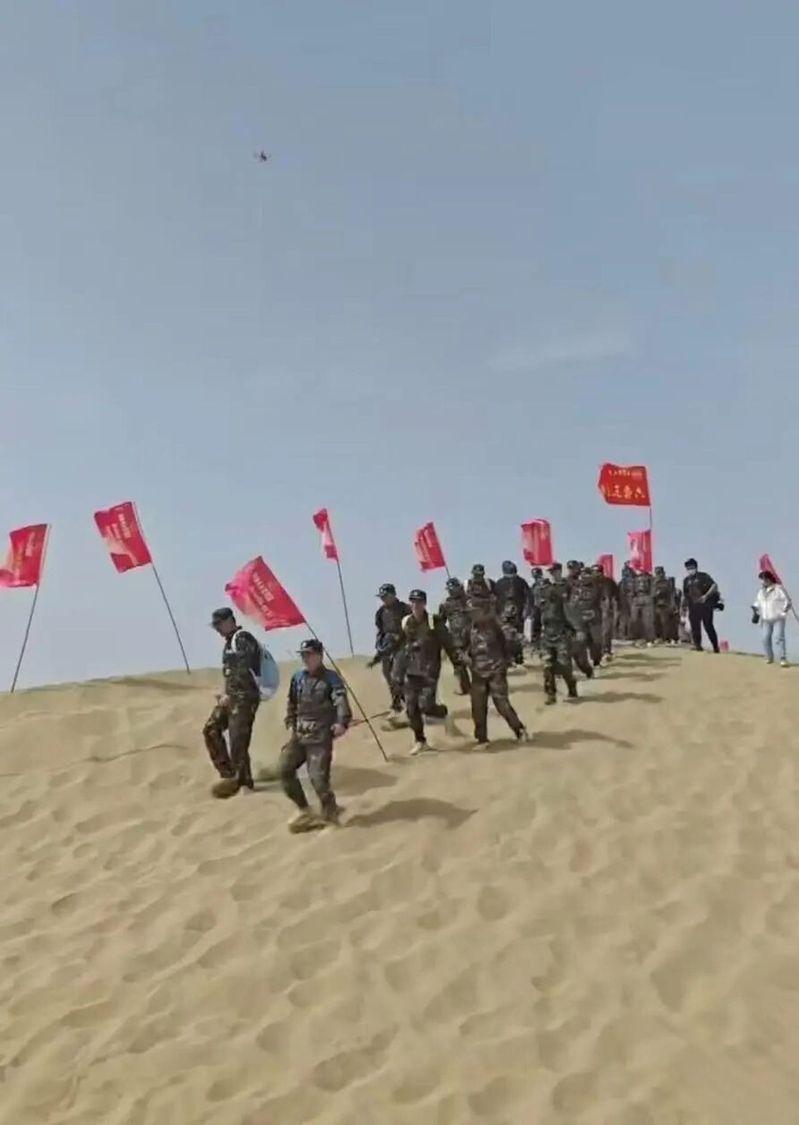 极目新闻报导,第一批680余名学生在用过午餐后进入沙漠开始拉练,整个行军路程12公里左右,耗时将近3小时。在行军过程中,学生们也参与了匍匐前进、沙漠拉烟等实战化训练项目,让他们沉浸式体验行军作战氛围。