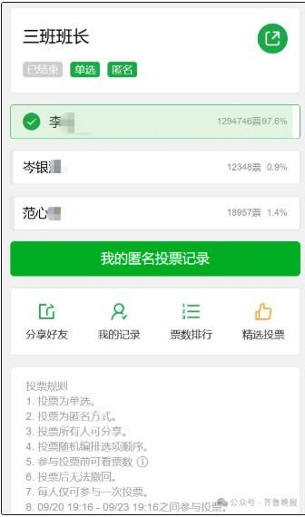 9月23日下午,一则为某学校「三班班长」而发起的微信小程序投票,因投票链接被意外分享至外部社交平台,经过微信社群裂变传播,最终吸引了超过132万网友参与投票,其中一位班长候选人李浩的票数从当天17:00飞涨至70万票,到晚上19:16投票结束,李浩以129万4746票(97.6%支持率)当选班长。这起事件昨引发舆论关注,有网民调侃「谁说中国没有选票?」,也有媒体批评这是网民解构权威、释放集体无聊情绪的荒诞符号。