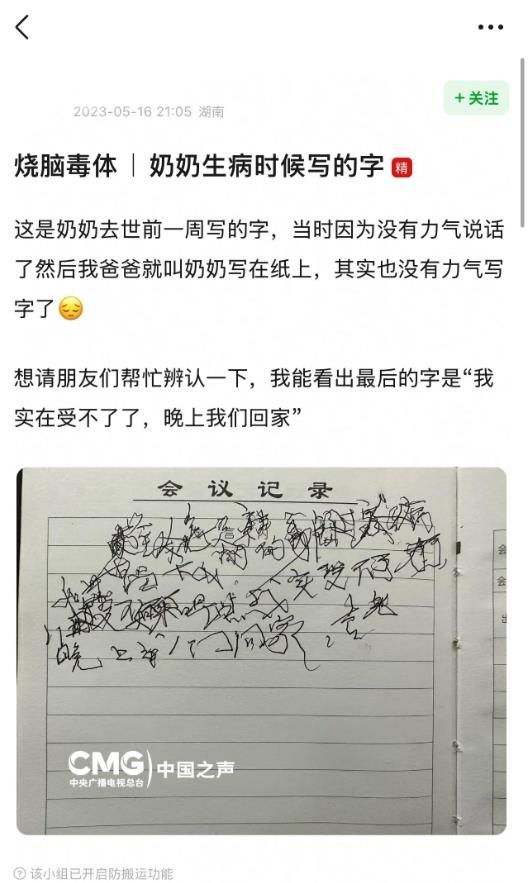 「求助者的奶奶在病房里写了一些字,一名女网友认不出来,所以来求助。因为我们小组一直是娱乐为主的,第一次出现这个帖子,我心情非常沉重」,冀梦雨说,求助者的奶奶用尽力气写了四五行,笔画扭曲、行列交叠,有些字是相对清楚的,比如「我」、「留下」、「晚上」;她给这则帖子设置了最高的曝光度,希望有更多人可以看到,但大多数的字,直到今天也没人能给出确切的答案。