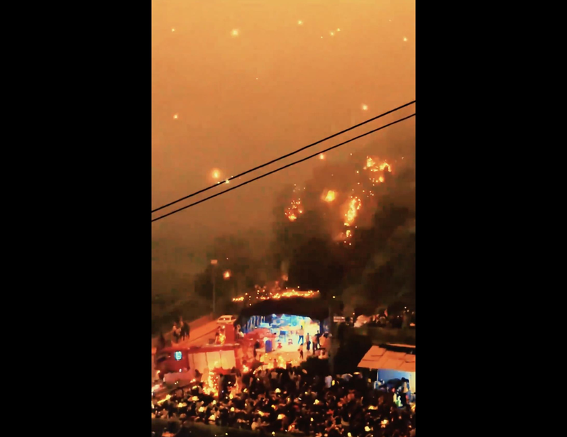 网友上传的影片显示,现场观众除纷纷走避从天而降的烟火,还有人将椅子举在头顶,以防被坠落的烟火砸中,而坠落的烟火还一度引发火警。