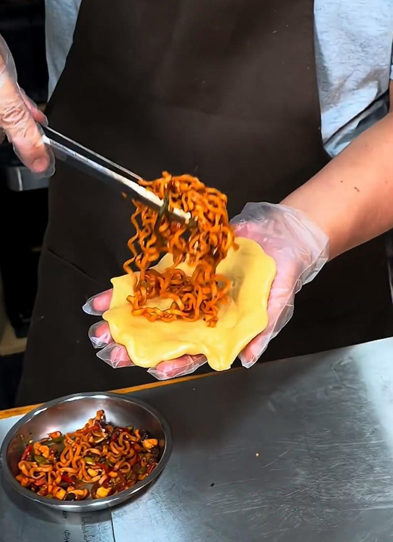 香港01报导,从浙江厨师「Ayu速食」上载的影片看到,他先将方便面煮好,还放入南瓜子、杏仁、腰果、核桃仁、芝麻、葡萄干等配料,然后搅拌在一起。接着他揉面团,再将调味好的即食面当成内馅包进面团里,并放入模具压出月饼的形状,最后放进焗炉。