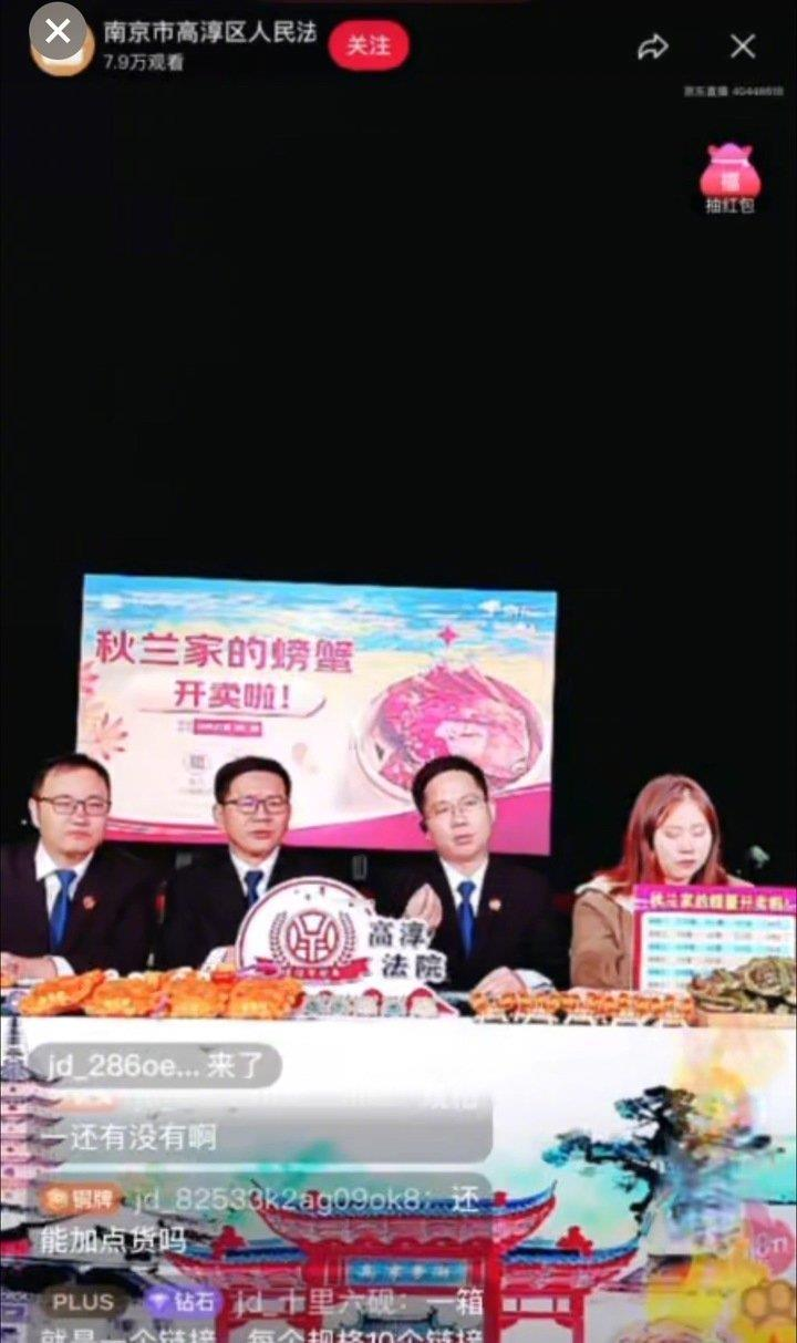 上游新闻报导,有网友发帖31日晚称,在南京市中级人民法院的微信公众号直播间,看到高淳区法院法官「带货卖螃蟹」,画面颇为新奇,引发热议。视频显示,多位身着制服的法院工作人员出现在直播镜头前,介绍售卖的螃蟹。