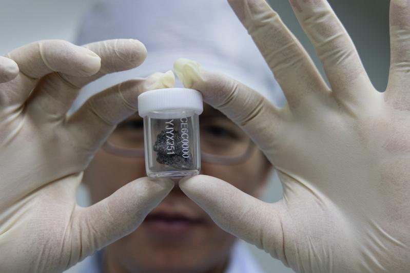 中国科研团队近日通过分析嫦娥六号采回的月背南极-艾特肯盆地月球样品,首次发现大型撞击事件成因的微米级赤铁矿(α-Fe2O3)和磁赤铁矿(γ-Fe2O3)晶体。图为科研人员在月球样品实验室展示嫦娥六号月球样品。(新华社数据照片)