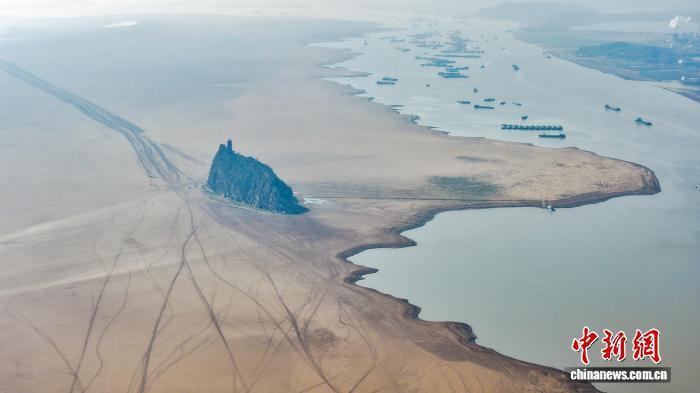 12月14日,江西湖口,随着鄱阳湖水位走低,昔日丰水期被淹水中的鞋山岛露出水面。(取材自中新网)