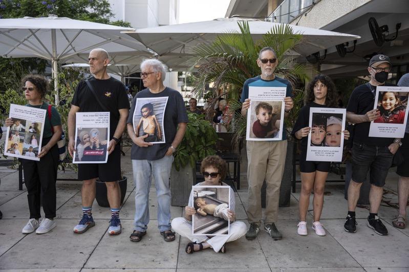 一群以色列左翼人士和阿拉伯裔居民23日在特拉维夫市一处广场,举着营养不良的加萨孩子照片参与反战、反饥饿示威,呼吁「停止种族灭绝」。(美联社)