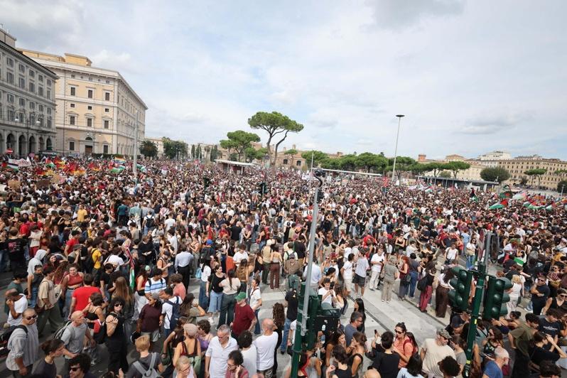 约有2万人22日聚集在罗马特米尼(Termini)火车站,其中许多是学生,他们高喊「解放巴勒斯坦」,并挥舞巴勒斯坦国旗。欧新社