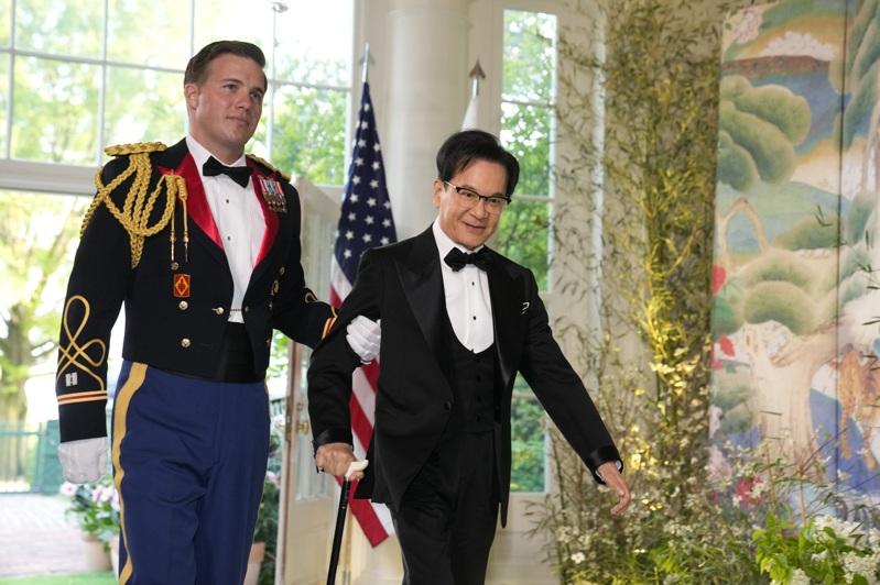 CJ集团会长李在贤 (右)2023年4月随南韩前总统尹锡悦访问美国。 (美联社数据照片)