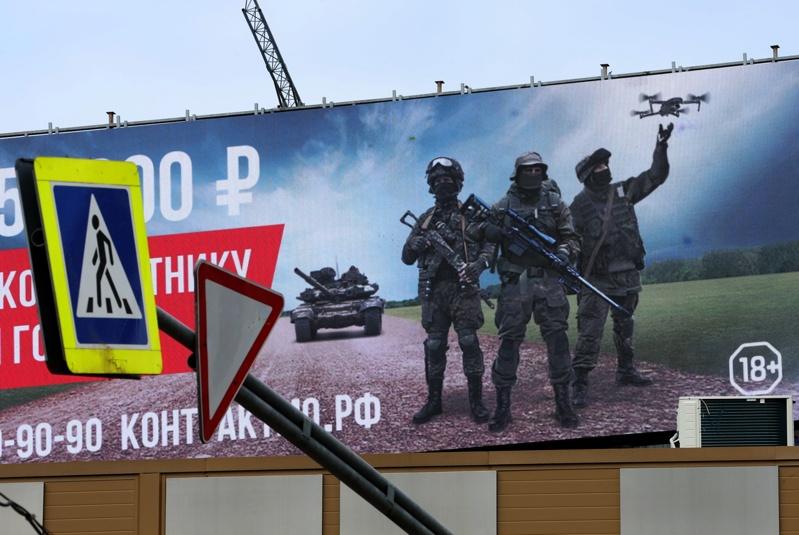 今年8月在俄罗斯莫斯科,一个电子屏幕上播放着征兵广告,画面中出现俄军士兵的身影。 欧新社