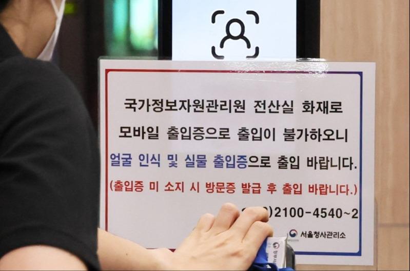 9月29日,一名人员试图进入南韩首尔政府建筑。张贴公告称,由于大田数据中心发生火灾导致政府电脑网络中断,行动通行卡暂停使用 。欧新社