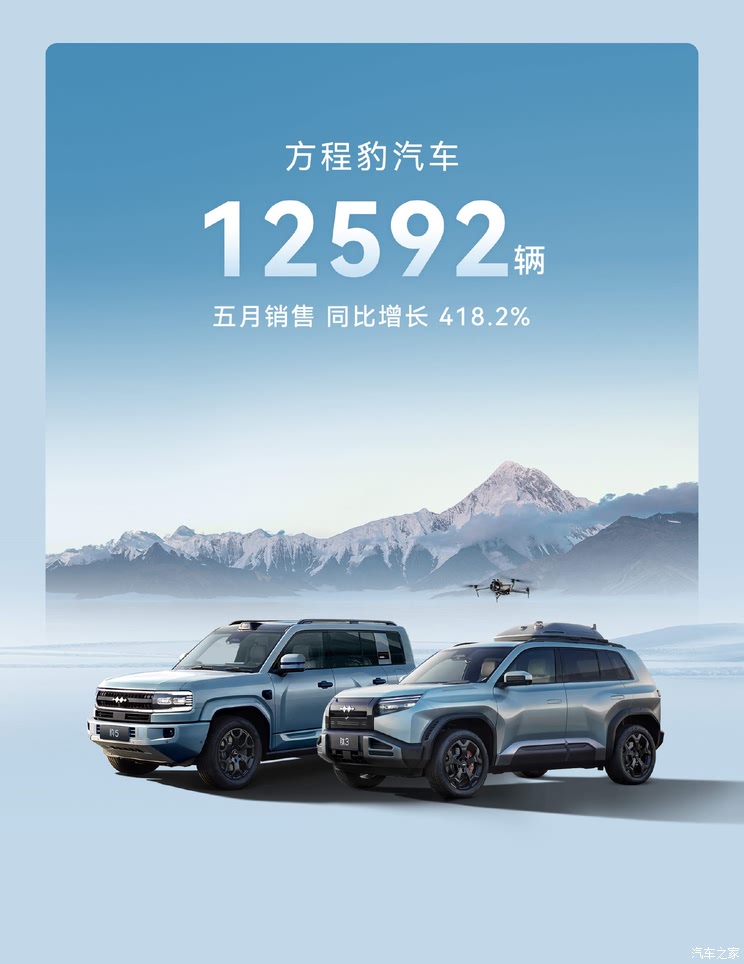 就在此前,比亚迪集团公布5月份销量,其中方程豹汽车销售12592辆,同比增长418.2%。同时,方程豹汽车已完成10万台交付成绩,仅用时18个月。目前,方程豹品牌已推出包括豹5、豹8、钛3共计三款车型。