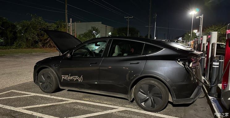 从实车图来看,Robotaxi似乎与普通版的Model Y没有任何区别,在车头、车门、尾部都有艺术字体的Robotaxi字样,同时,该车还在特斯拉超充站完成充电。
